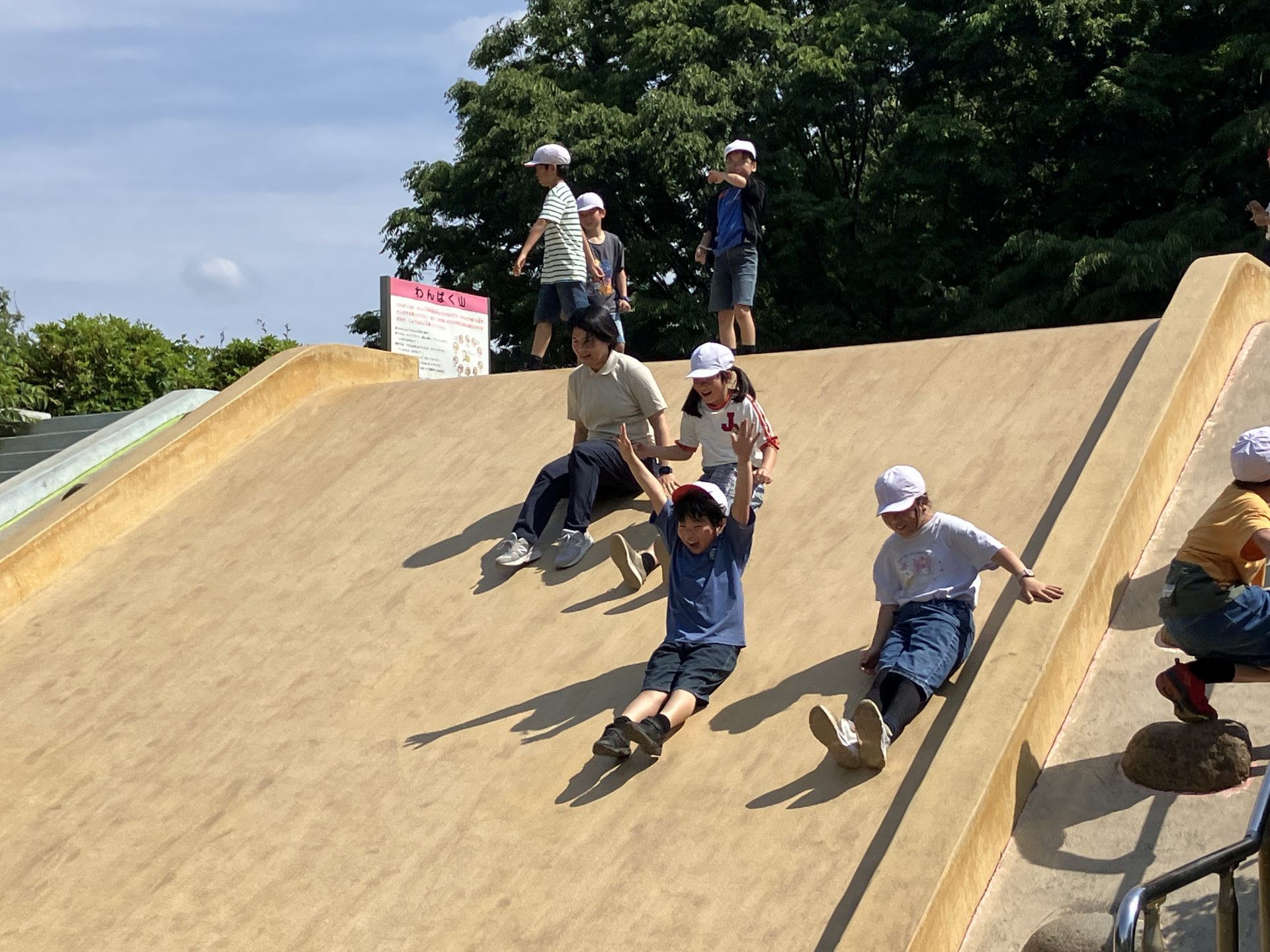 続いては、小金井公園に移動してお弁当タイム。「毎日外でご飯が食べられたらいいのになぁ」と笑顔で話しながら、おいしい昼食をいただきました。そしてお待ちかねのクラスでの自由遊びです。ソリ広場とアスレチック広場、そして芝生での学級遊びの3つをクラスごとにローテーションで回りながら遊びました。猛暑の中でしたが、みんな汗をかきながらも大満足の遊び時間を過ごしました。