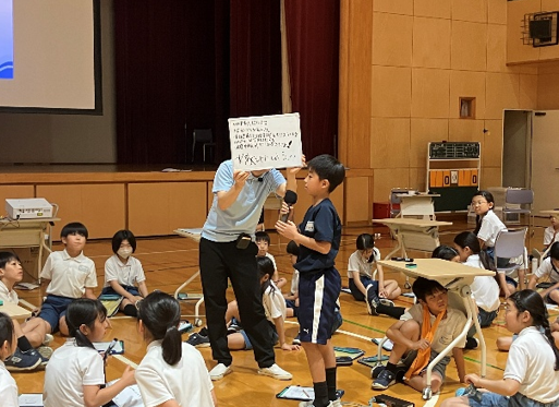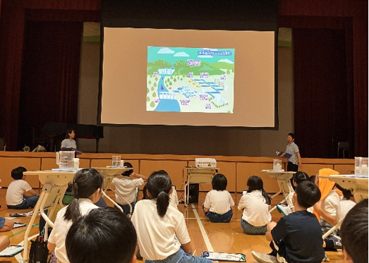 12日(土)に東京都水道局による「水道キャラバン」出前授業を行いました。水源林やダム、浄水場などの映像やそこで働く人々のお話、クイズなど、短時間で多くの学びがある授業でした。中でも、浄水場で水をきれいにする仕組みについてのろ過実験は、実際に目の前で水がきれいになっていく様子を見ることができ、子どもたちは興味津々でした。そのほか、お味噌汁一杯を魚が住める水質にするまでにどのくらいの水の量が必要かを考えたり、災害に強い水道管やもしもの時の災害時給水ステーションのことを学んだりしながら、資源としての「水」の大切さを知ることもできました。出前授業の最後の振り返りでは、1学期の社会科の授業も含めて、今まで学んできたことが実際の自分の生活により関係があることを実感し、自分事として受け止めている様子が伝わってきました。