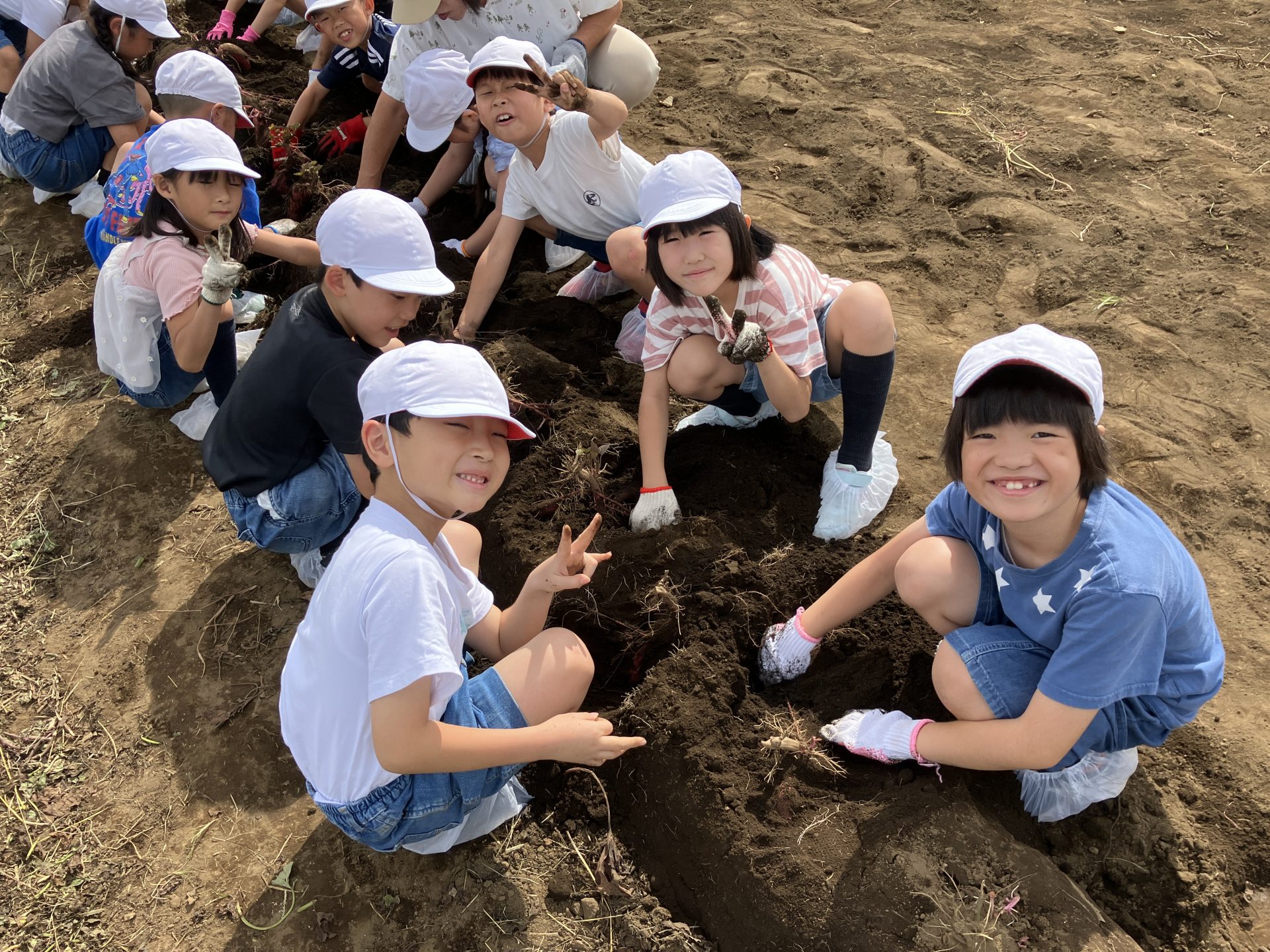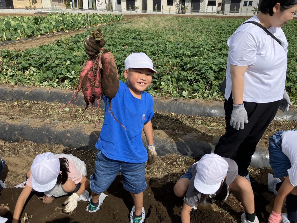 バスに乗り、サニー農園へ。大きな畑を見て、みんな驚いていました。軍手と靴袋を履き、準備万端で畑に向かいました。農園の方から、芋ほりの方法やこつを聞き、芋ほりスタート。周りの土を掘ってから引き抜くとのことでしたが、お芋の根っこが土の奥深くまであり、一生懸命土を掘っていました。引き抜いて、お芋の大きさにみんな驚いていました。色は、とてもきれいな紫色で、どれもとても大きくて重たいお芋でした。掘れたお芋をもって、嬉しそうに見せてくれました。掘った後は、たくさん掘れたお芋を見て、どうやって食べようか、嬉しそうに話していました。