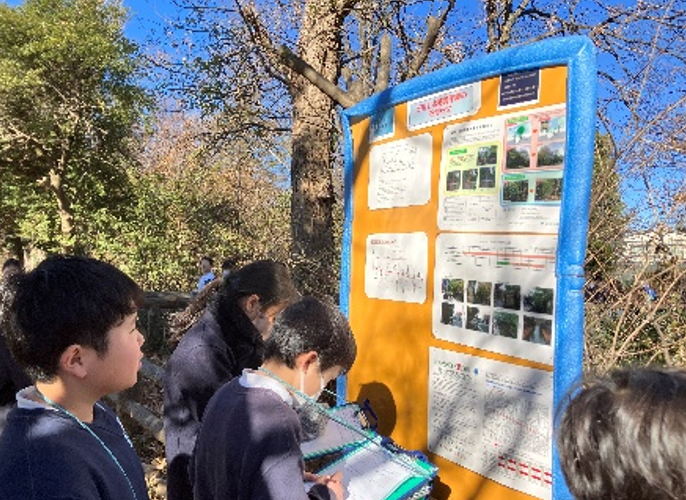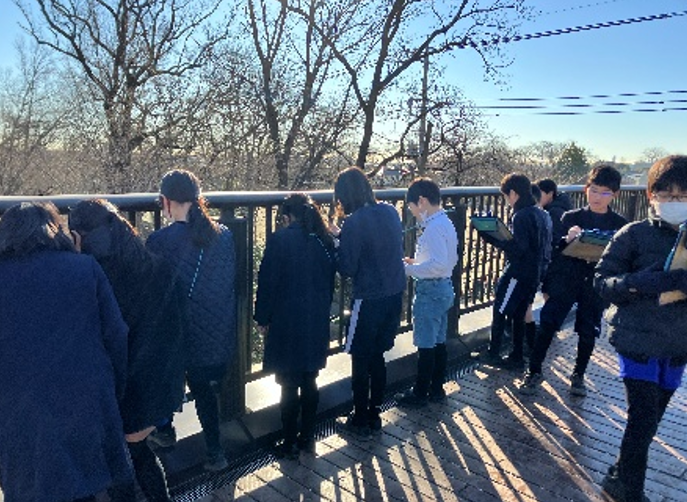 学習の最後には、「今の玉川上水を見に行こう!」と、寒い中ではありましたが、クラスごとに玉川上水を散策しました。「確かに、水は西から東に流れているね」「木にテープが貼ってあるよ」「あのパイプは何だろう」と、たくさんの発見をしながら歩く子どもたち。幸運なことに、実際にお仕事をされている植木屋さんと出会い、インタビューをすることができたクラスもありました。通学路としていつも歩いていたはずの玉川上水ですが、学習を通して見方が変わり、世界が大きく広がりました。「先生、帰り道に赤いテープが貼ってあった木を数えてみたよ」など、授業と生活をつなげ、自ら学びを深めていく姿も見られました。